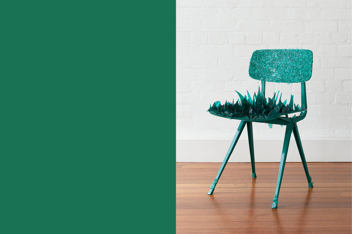 Albeit exaggerated, the broken glass shards symbolise the need to curtail the use of painful materials for ‘the civic good’… My chosen material is recycled antique stained glass, which serves to highlight the beauty to be found in reclamation - the ‘making good’. And the colour green? Well, it’s all about the dollar, or lack of it, that drives and affects creators and victims of these insidious design methods.